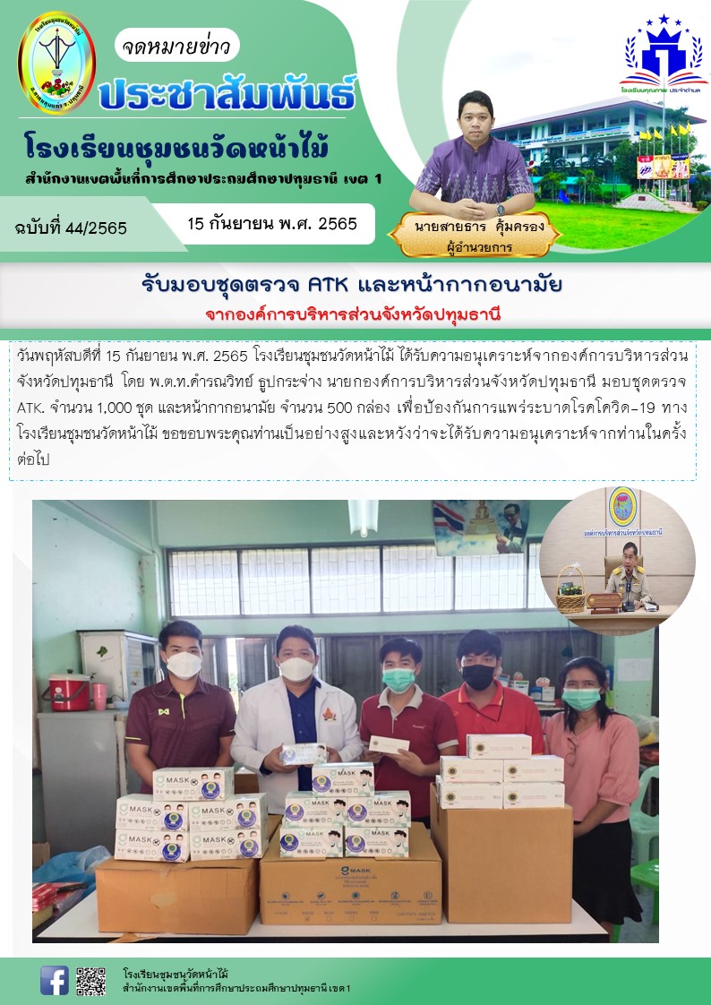 รับมอบชุดตรวจ ATK และหน้ากากอนามัย จากองค์การบริหารส่วนจังหวัดปทุมธานี
