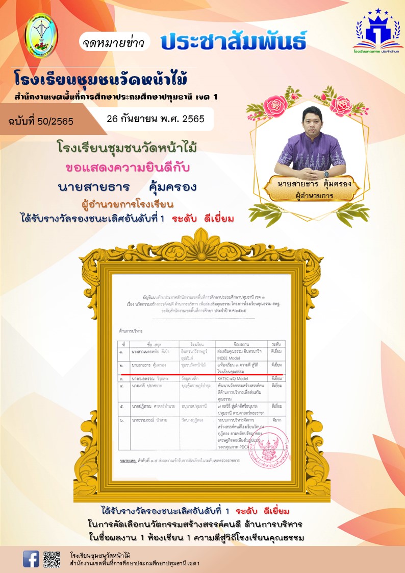 โรงเรียนชุมชนวัดหน้าไม้ ขอแสดงความยินดีกับ นายสายธาร คุ้มครอง ผู้อำนวยการโรงเรียน ได้รับรางวัลรองชนะเลิศอันดับที่ 1 ระดับ ดีเยี่ยม