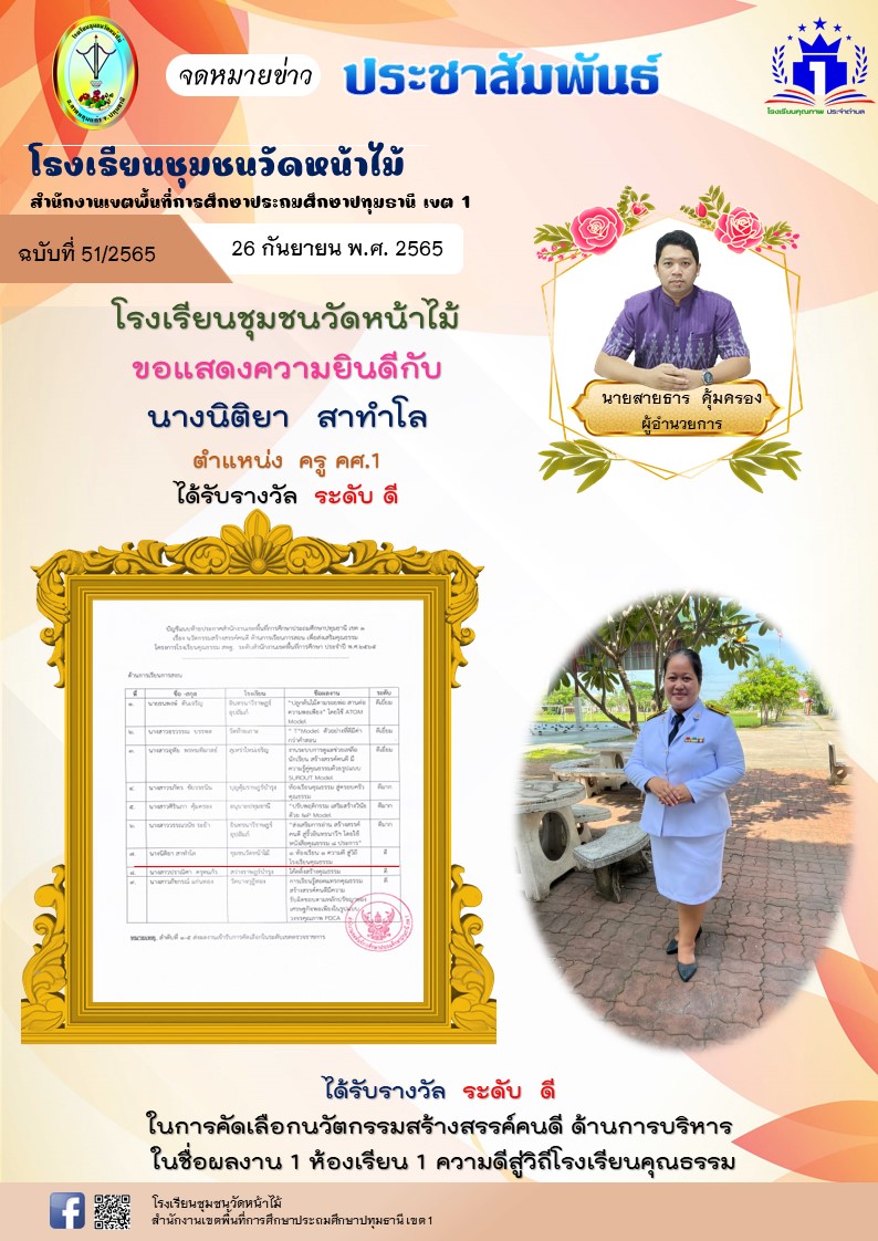 โรงเรียนชุมชนวัดหน้าไม้ ขอแสดงความยินดีกับ นางนิติยา สาทำโล ตำแหน่ง ครู คศ.1 ได้รับรางวัล ระดับ ดี