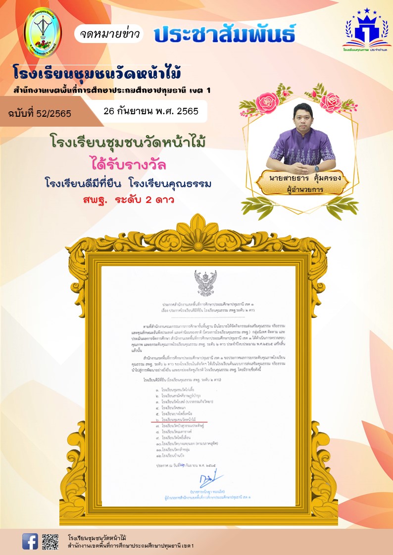 โรงเรียนชุมชนวัดหน้าไม้ ได้รับรางวัล โรงเรียนดีมีที่ยืน โรงเรียนคุณธรรม สพฐ. ระดับ 2 ดาว