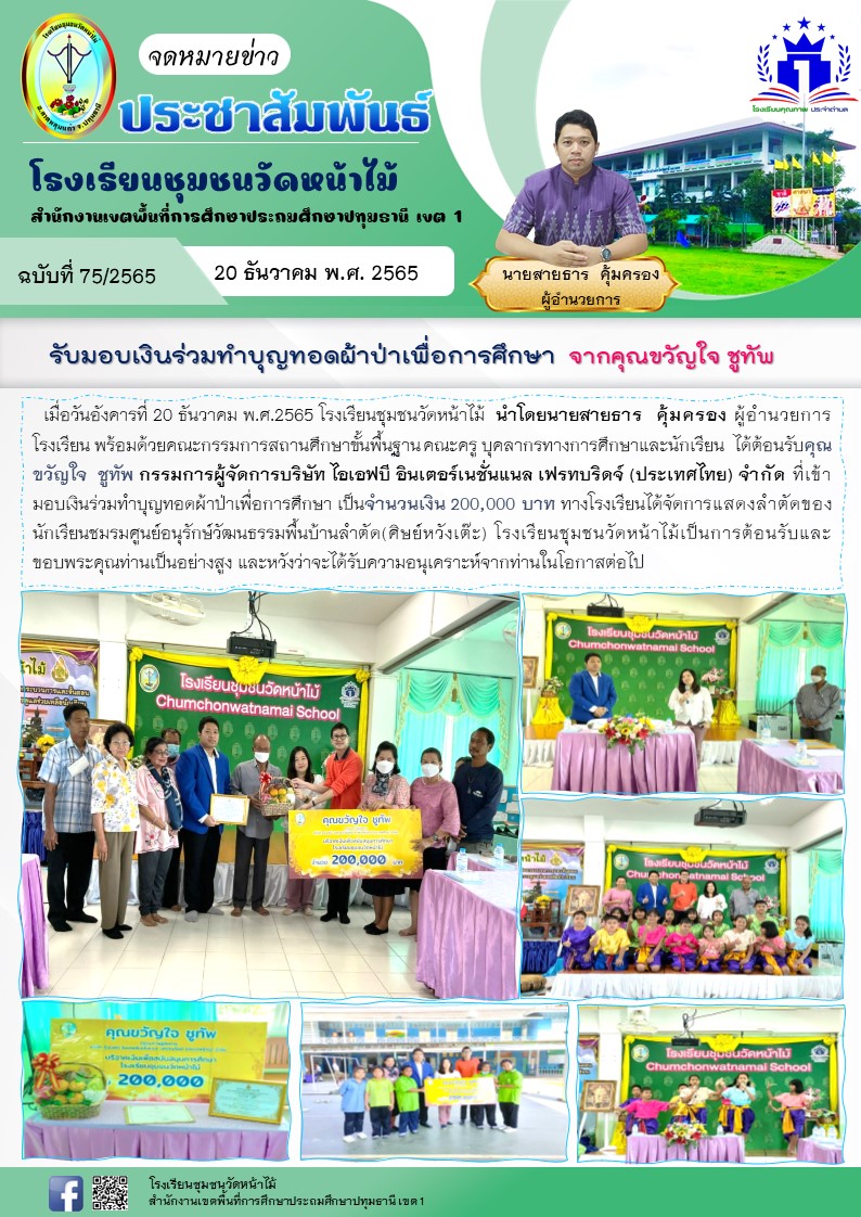 รับมอบเงินร่วมทำบุญทอดผ้าป่าเพื่อการศึกษา จากคุณขวัญใจ ชูทัพ
