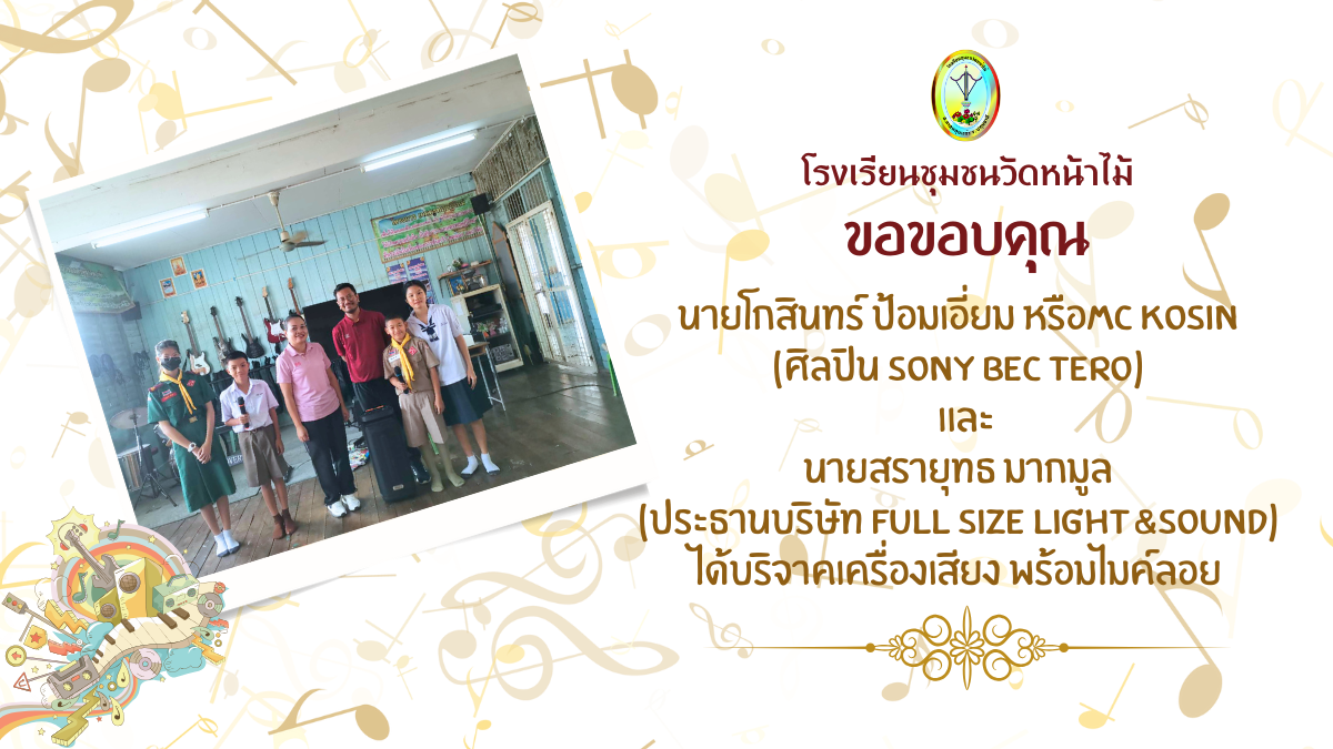 ขอบคุณ นายโกสินทร์ ป้อมเอี่ยม หรือmc kosin (ศิลปิน sony BEC tero) และ นายสรายุทธ มากมูล (ประธานบริษัท Full size light&sound) ได้บริจาคเครื่องเสียง พร้อมไมค์ลอย