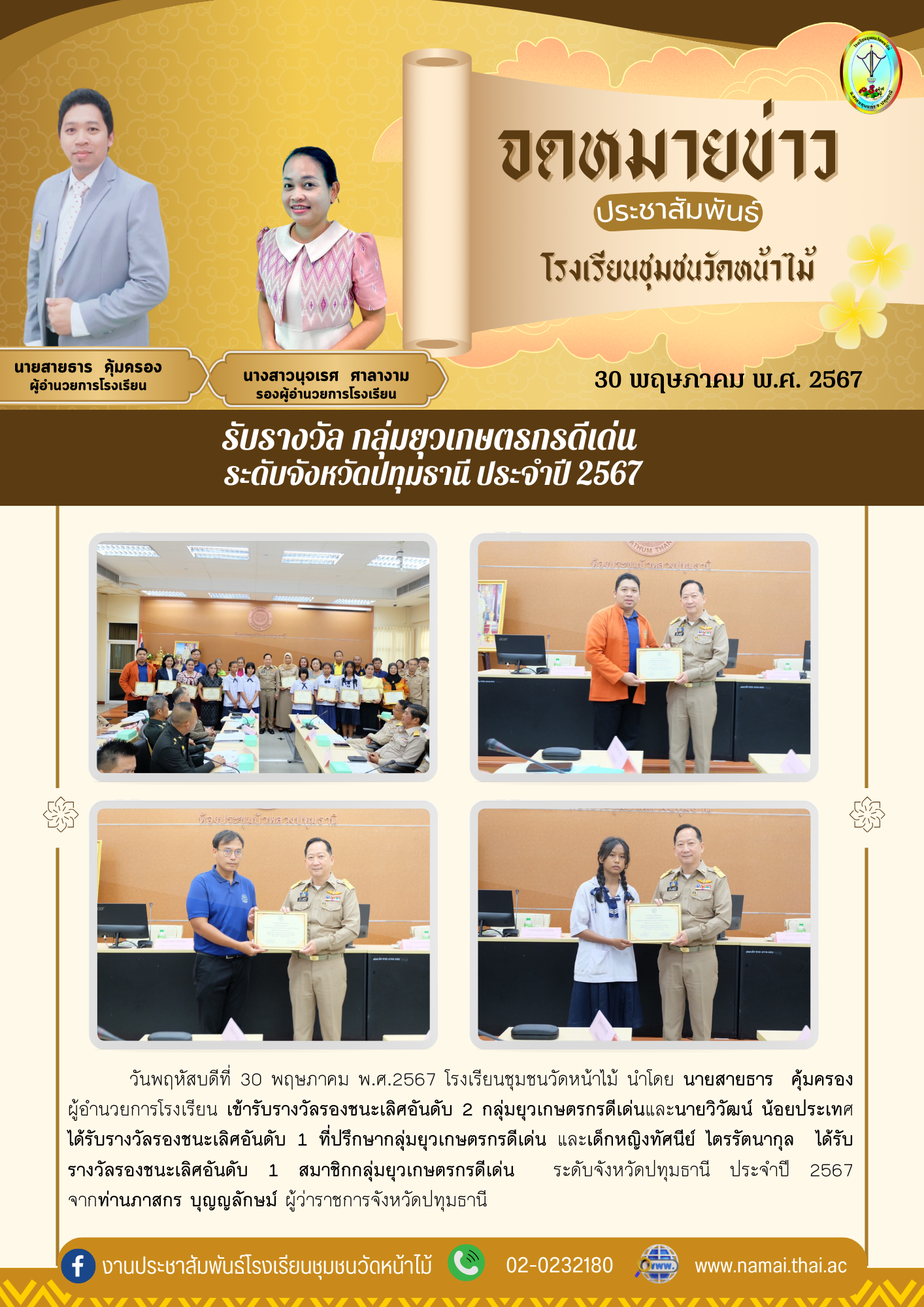 รับรางวัล กลุ่มยุวเกษตรกรดีเด่น ระดับจังหวัดปทุมธานี ประจำปี 2567
