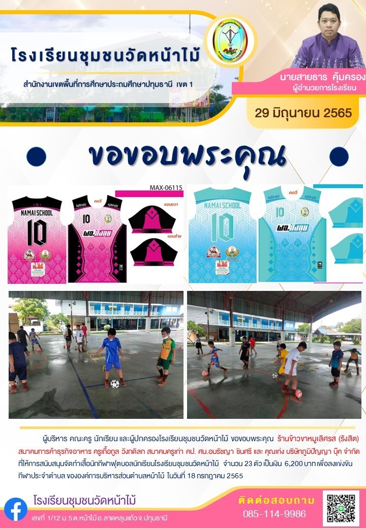 ขอขอบคุณ ร้านข้าวขาหมูเลิศรส (รังสิต) สมาคมการค้าธุรกิจอาหาร คุณเกื้อกูล วังกดิรก สมาคมครูเก่า คป. ศน.อมรัชญา ชินศรี และคุณเก่ง บริษัทภูมิปัญญาจำกัด ที่ให้การสนับสนุนจัดทำเสื้อนักกีฬาฟุตบอลนักเรียนโ