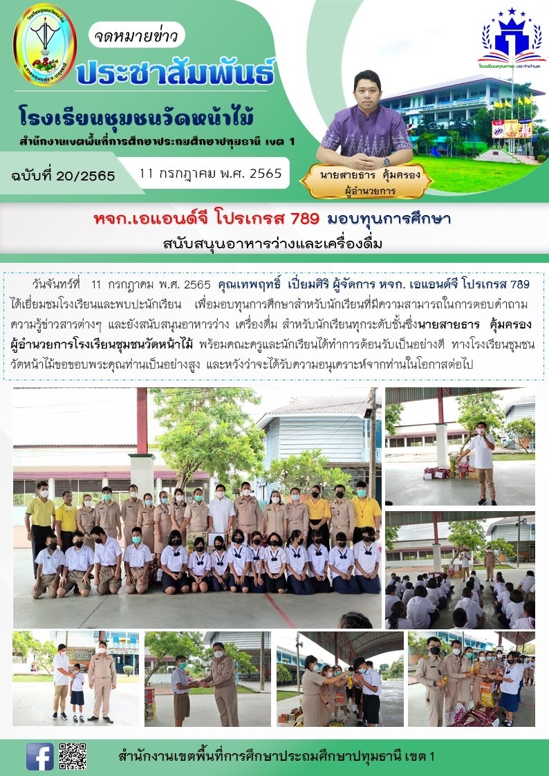 หจก.เอแอนด์จี โปรเกรส 789 มอบทุนการศึกษา สนับสนุนอาหารว่างและเครื่องดื่่ม นักเรียนโรงเรียนชุมชนวัดหน้าไม้